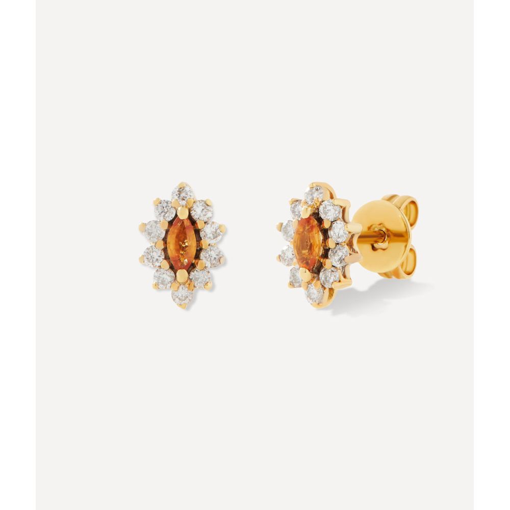 Brinco em ouro amarelo 18kr. Este brinco possui safira laranja 0.140ct e diamantes 0.240ct em lapidação navete.