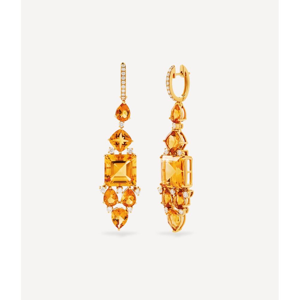 Brinco longo citrino e brilhantes em ouro amarelo 18kt. Este brinco possui diamantes 0.480ct e citrino 18.800ct em lapidação brilhante.