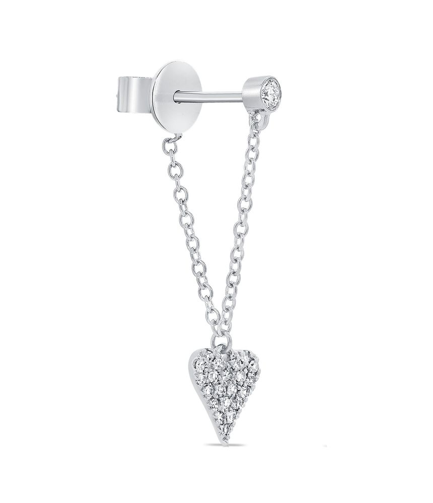 Brinco único chain heart de ouro branco 14kt com diamantes em lapidação brilhante