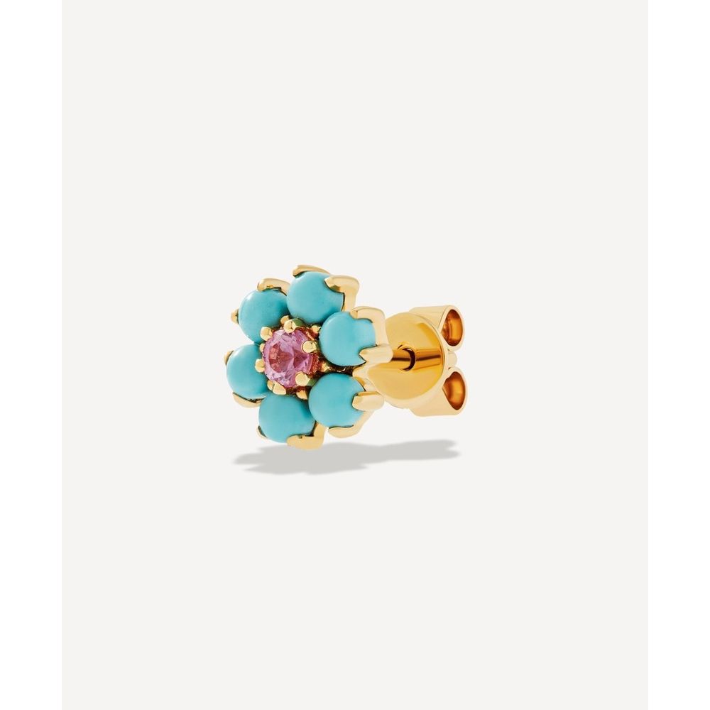 Brinco stud único turquoise daisy baby de ouro amarelo 14kt. Este brinco possui safira rosa e turquesa em lapidação brilhante.